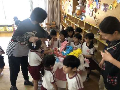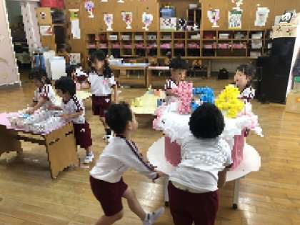 午後、4歳児が大きなホールに美味しそうなクリームをつくって5歳児の保育室に持っていき、次に5歳児がイチゴをのっけて・・