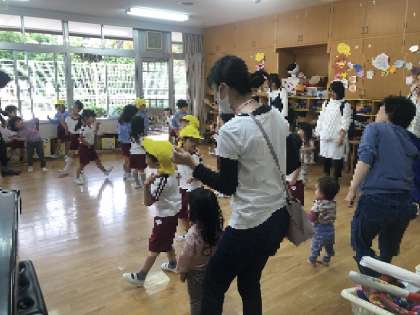 途中から雨が降り出したので、急遽5歳児保育室で♪ちょっとだけたいそう♪をしました。