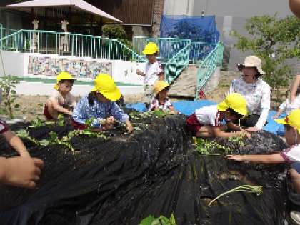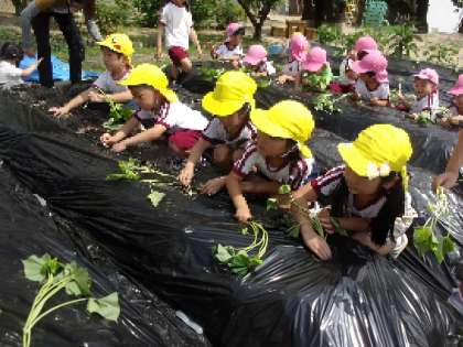梅雨空の晴れ間を見つけ、畑の畝にサツマイモの苗を植えました。