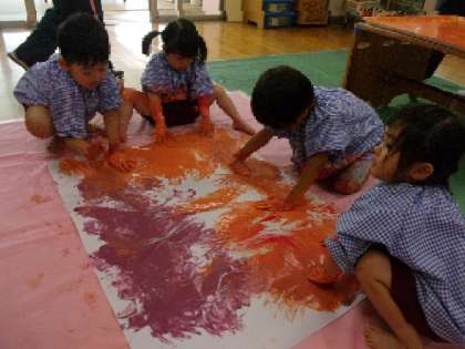 存分に楽しんだあと、大きな紙を用意したら、次々と絵の具だらけの手でパンパンとハンコのように押していったり、すりこんでみたり、板の上とは違った感触を紙上で楽しんでいました。