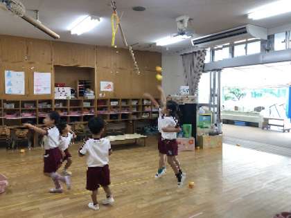 自分の精一杯の動きで挑戦しています。何度も何度もボールをつかんで投げていました。