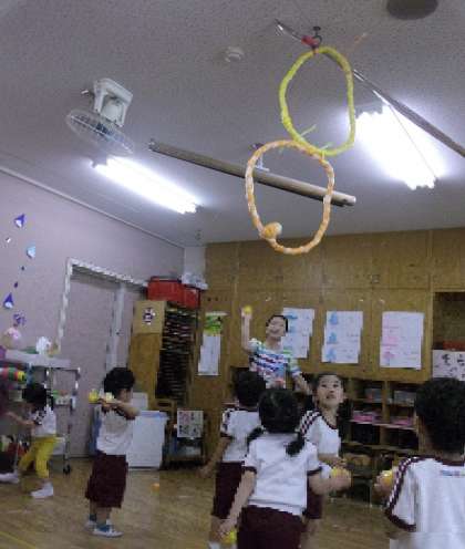 それを見た子どもたち、たちまち星のボールを持って、輪にくぐらせようとどんどん投げていきました。