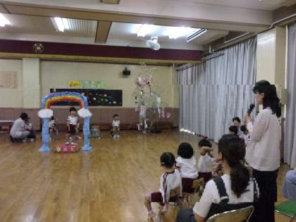 途中、先生からブラックライトを使ったパネルシアターで七夕の話を見て・・今夜、織姫と彦星 天の川で会えるかな・・