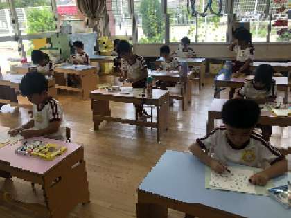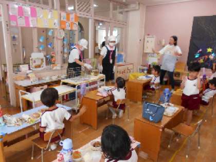 「美味しい昼食、ありがとうございました」「2学期もよろしくお願いします」と感謝を込めて4歳児は星のペンダント、5歳児は手紙を調理員さんにプレゼントしました。