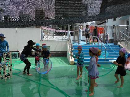 うまくタイミングがとれない子どもたちにはフープを使って、水の流れと体を前に押し出して滑る心地よさを味わっていました。