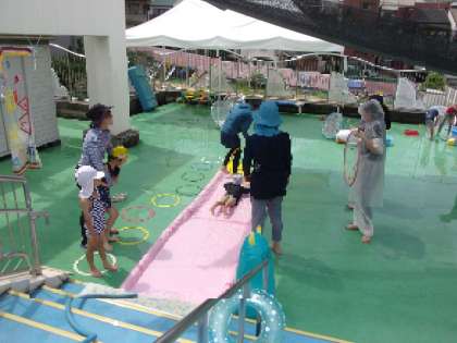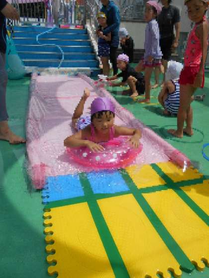 最終は5歳児。ウォータースライダーに挑戦する子どもたちも増えてきました。足で階段を蹴るタイミングや体の体制なども自分なりに考えていました。