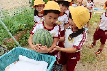 今日は、5歳児が収穫!4歳児が収穫したスイカより少しひとまわり大きい分重くて立派でした。