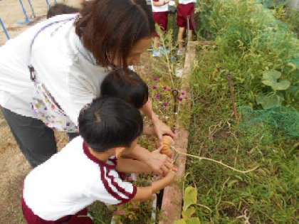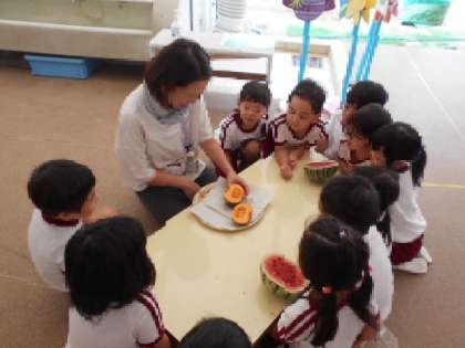 少し遅めの収穫・・(4歳児) 公開日 2023/09/22 更新日 2023/09/22 園児の様子 今年最後のスイカとカボチャの収穫。 以前にも収穫したこともあって、ワクワク感いっぱい! スイカはスパッと割った瞬間、甘い香りが漂いました。 大分、熟れていました。 カボチャの断面を見るのは初めてで、興味津々。 切った瞬間 「黄色や!昨日食べたおみそ汁の中に入ってたよね」 よく覚えていました。 いいね(0)