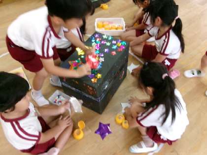 この箱は?・・ (5歳児) 公開日 2023/10/05 更新日 2023/10/05 園児の様子 5歳児の保育室に行くと、黒い箱に沢山の星をつけていました。 「この箱はなぁに?」と尋ねると 「魔法でこの箱の中に金メダルを出すの」 どうか運動会までに、出てきますように・・ 魔法使いさん、よろしくね いいね(0)