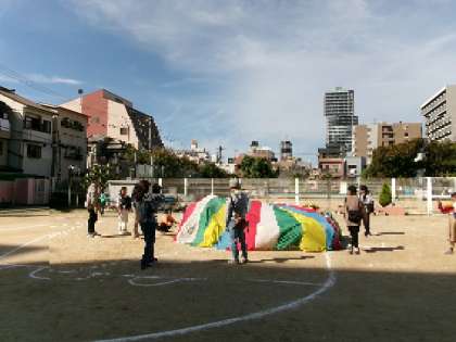 5歳児が先導し、バルーンを揺らしたりふくらませたり、中に入ったり・・大きな歓声が!