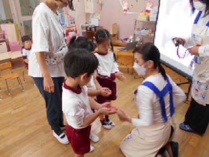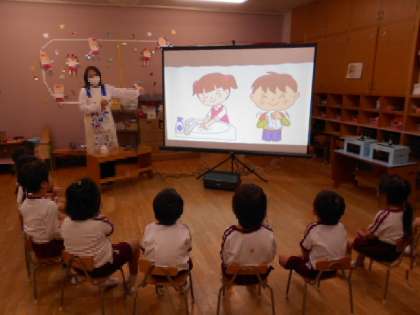 今回、手洗いの大切さを分かりやすく話してくださり、魔法のスタンプを使って洗い残しがないかをたしかめていました。