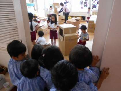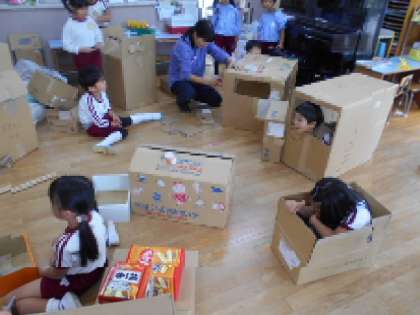保育室では沢山の段ボールの箱を使ってつくっている姿が見えました。