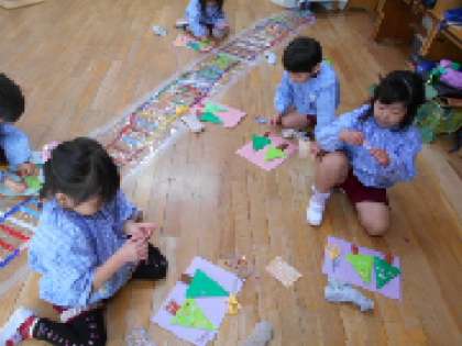 4歳児は折る活動を幾度も経験しているのもあって、指先をうまく使い、キラキラな飾り付けを楽しんでいました。