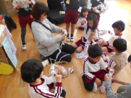 4歳児が折り紙、5歳児は芋のツルでつくったリースをつかっていました。