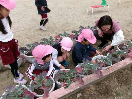 4歳児は育てているブロッコリーの様子を見に行き、休み中も元気に育っていたか、ムシがついて葉を食べていないかを確かめていました。