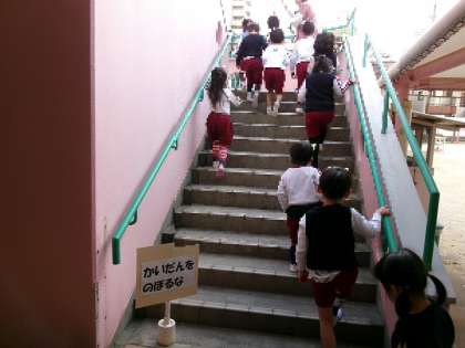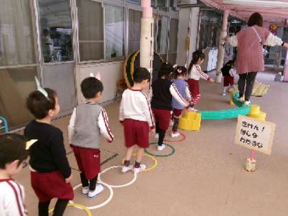 ニャンニャンねこたち どこへ行く(4歳児) 公開日 2024/01/16 更新日 2024/01/16 園児の様子 かわいいねこたちが・・ 「きけん!はしをわたるな」の看板を見つけ・・ え〜い 渡っちゃえ はしをこえると・・ 「かいだんをのぼるな」の看板が・・ え〜い のぼっちゃえ 2階のプレイルームについたねこたち スキップやコマで遊んで・・ ああ 楽しかった〜 いいね(0)