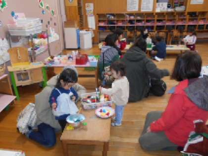 天候が思わしくなかったのですが、テラスと保育室を使って未就園児園庭開放すくすくくらぶがを行いました。ぬりえをしたり、ままごとをしたり・・・