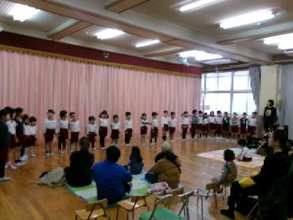 前半は保育室で遊び、後半はプレイルームで生活発表会で披露した4歳児の劇遊び、楽器あそび、歌、4.5歳児合同での歌を披露しました。