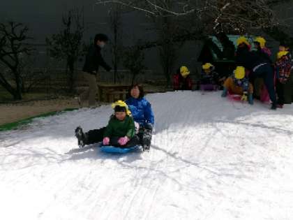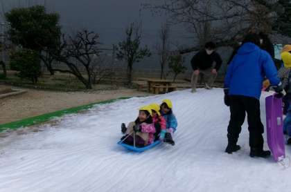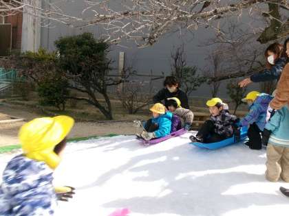 5歳児ともなると、1人用のソリで楽しむより、友達と2人、3人で滑る方が面白いことを感じているようでした。