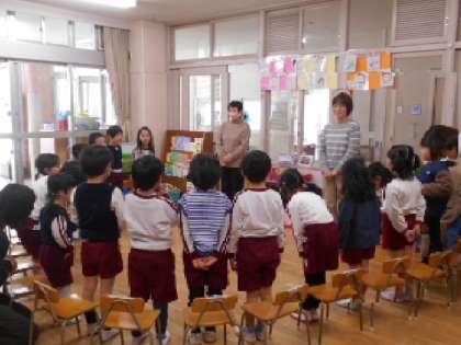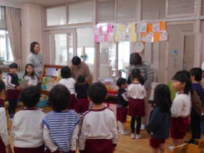 これまで、子どもたちのために愛情いっぱい込めてつくってくださった調理員の方々に、感謝を込めてお礼の言葉と手づくりのプレゼントを渡しました。