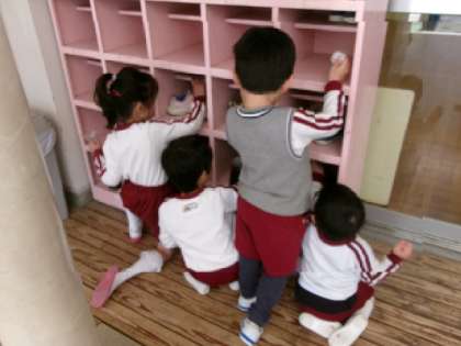 園庭や保育室など、1年間お世話になったところをみんなで掃除していると・・