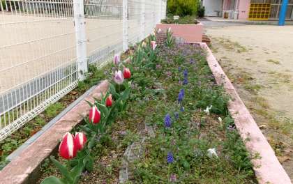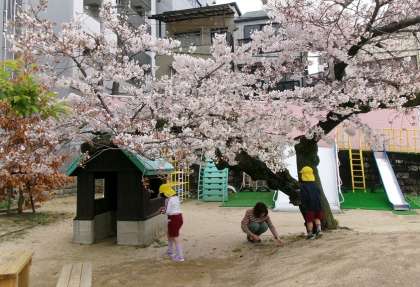 一時預かり事業参加(ハッピーらんど)の子どもたちがサクラの花が咲いているのを見て、「きれいなぁ〜」「かわいい」とつぶやき、落ちている花びらを手に取って遊んでいました。
