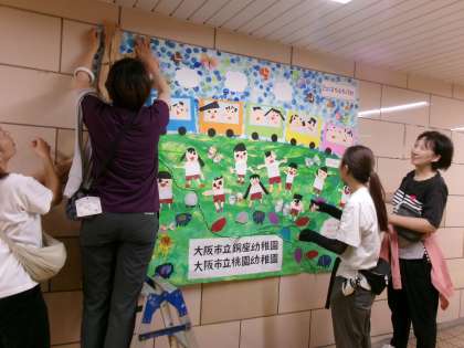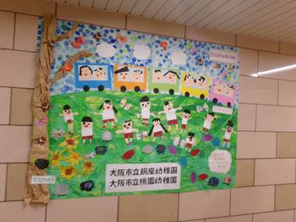 今日のお昼に銅座幼稚園の先生方と一緒に、谷町六丁目の駅の南改札と北東改札の間を繋ぐ通路に園児の作品を展示してきました。
