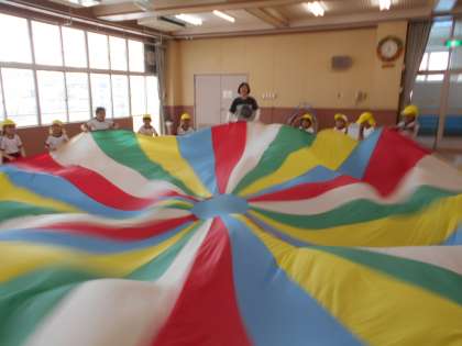 「わぁ〜大きい」と喜んで、みんなでバタバタしたり、お山をつくったりして遊びました。
