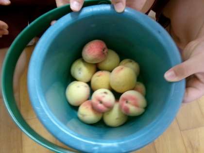 園庭に生っている桃を見つけ、足元に落ちている桃を拾い集めて、