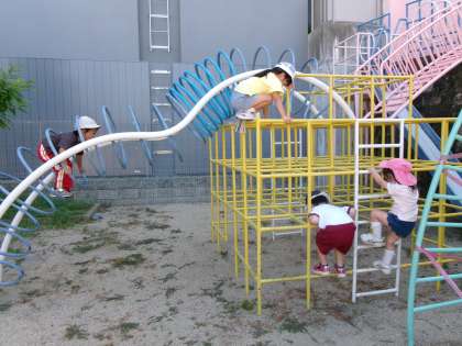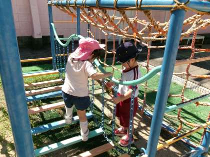 めばえくらぶ3 公開日 2025/09/24 更新日 2025/09/24 園児のようす 広い園庭でストライダーに乗って遊びました。「同じ!これ同じ!」ストライダーを指さして、お友達と一緒に乗っているのが嬉しくて、顔を見合わせながら楽しんでいました。 「これできるよ!」「見てみて!」お友達と同じ場場所で同じように遊ぶことが嬉しい時期ですね。ゆらゆら橋にもジャングルジムにも挑戦していく姿たくましいです。できた時にはにっこりとかわいい笑顔を見せてくれましたよ。 いいね(0)