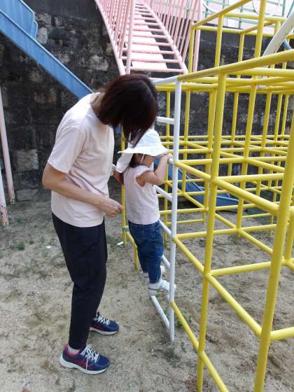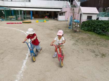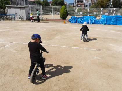 スケーターやストライダーにも挑戦し、友達がやっている様子を見ながら、自分なりに取り組んでいます。同じ遊びをするのが嬉しくて、一緒にいろんなところを散歩してはニコニコ笑顔を見せてくれています。