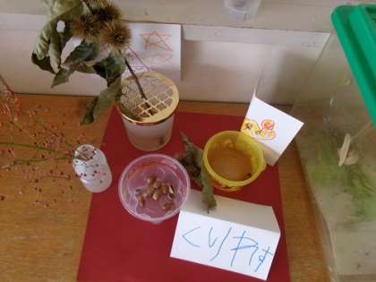 お家から持ってきてくださった「栗」もあったり、そばに秋の絵本があったり…。