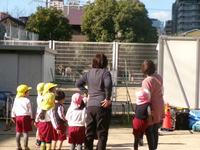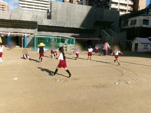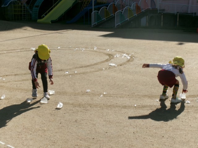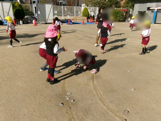 お楽しみ会が終わり、園庭に出ると、サンタさんのソリのあとが!