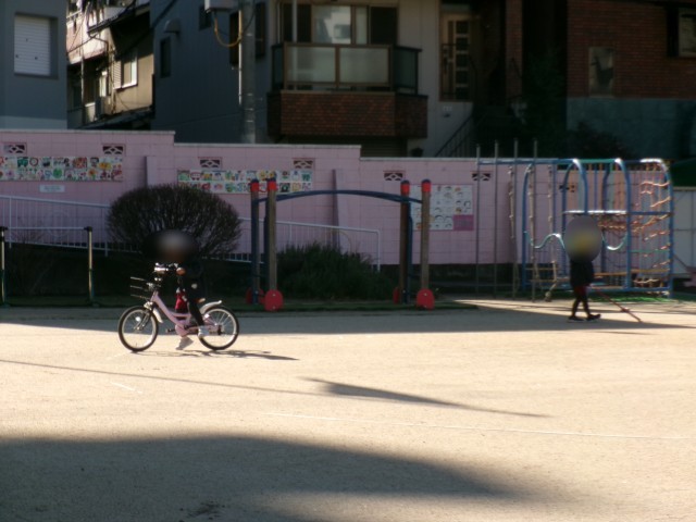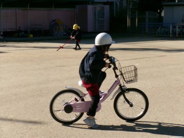 自転車の練習をする子どももいます。ヘルメットが防災用のヘルメットです。。。