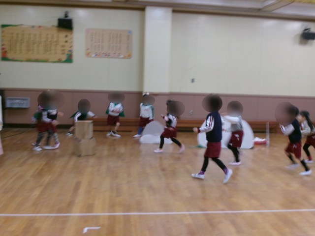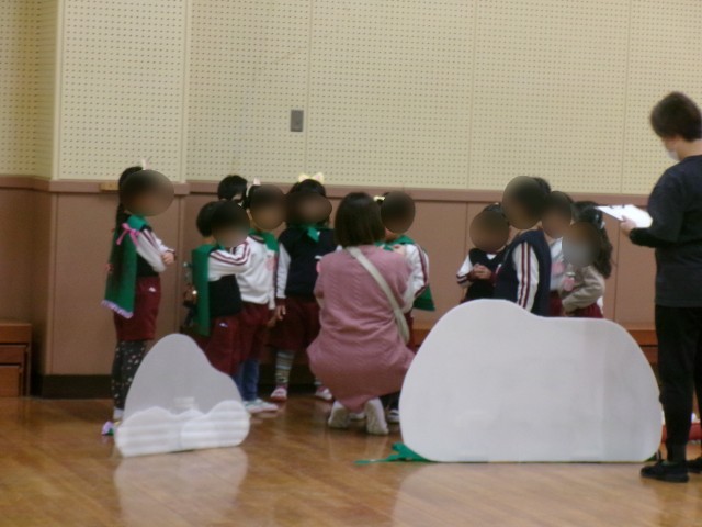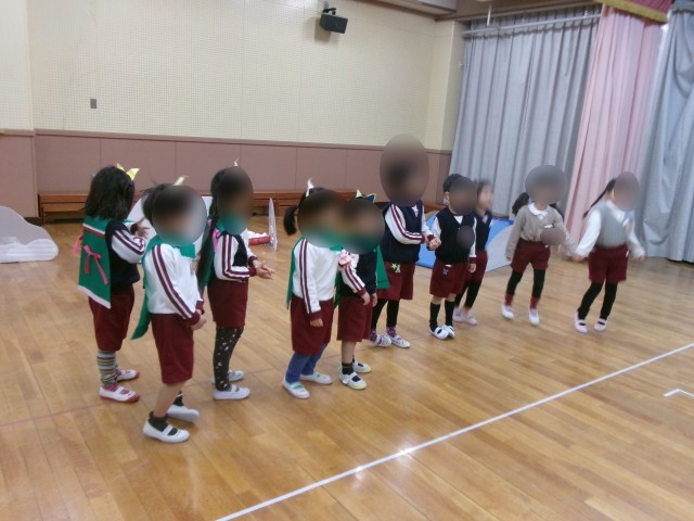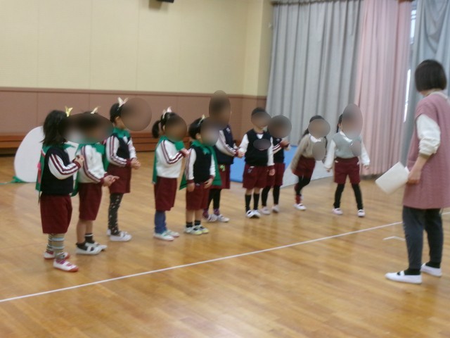 「鬼ごっこはとっても楽しい遊びだけど、劇の中では、鬼ごっこは危ないねー」と一つ一つをみんなで経験し、