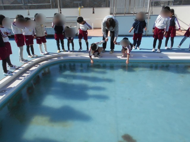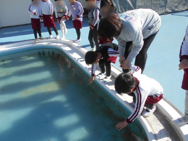 今日も寒い1日でしたね。給食の時間に「今日は寒かったね」「手が冷たかったね」などと話をしていたら、なんと、「プールの水が凍ってるよ!」とのお知らせが!!みんなで、プールに見に行きました。「わー凍ってる!」「触ってみたい!」とわくわくしながら見ていました。万が一、プールに落ちたら大変なので、先生と手をつないで順番に。「あ、つめたーい」「パリって割れた」「ほんまに凍ってるー」と氷の感触を楽しんでいました。「園庭のタライに水を入れておこうね。」「凍ってるかな」と楽しみに帰りました。さて、月曜日にはどうなっているのでしょう。