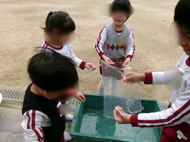2月9日朝の様子(氷とコマ回し)写真8枚