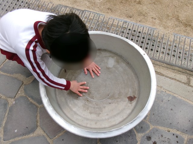 「つめた~い!」と言いながら、タライの氷を触って