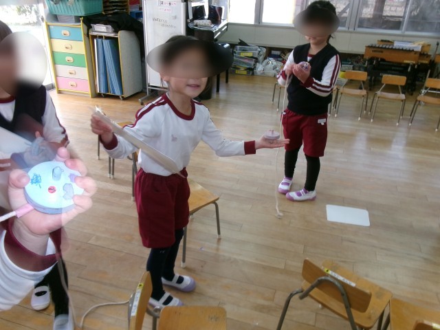 また、保育室ではコマ回しに熱中する子どもたちです。