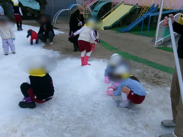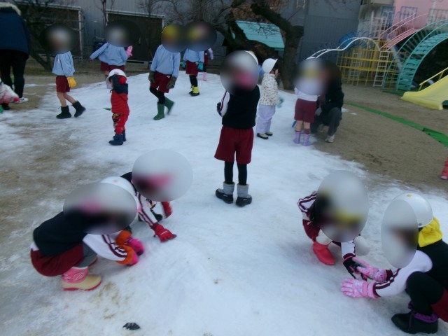 今日はすくすくくらぶの雪遊びでした。昨日、在園児が存分に遊び、夜の寒さですっかり凍っていました。