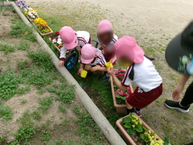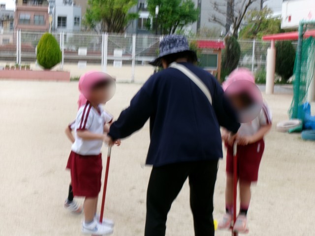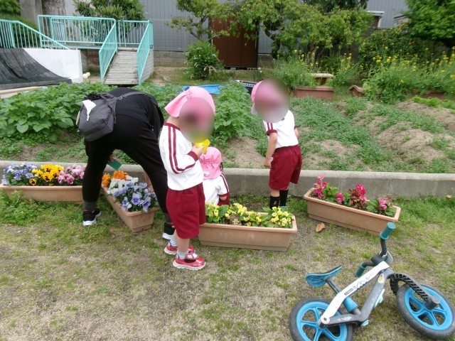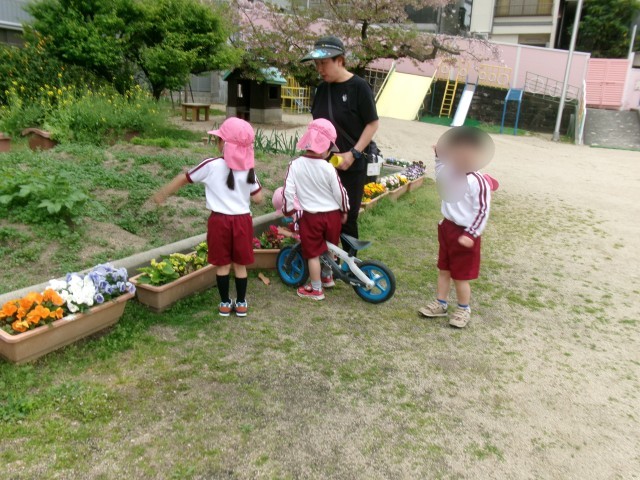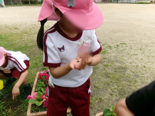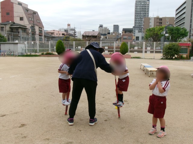 園庭では、ダンゴムシ探しをしたり、ホッピングに挑戦したりして遊んでいました。