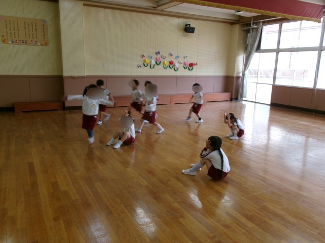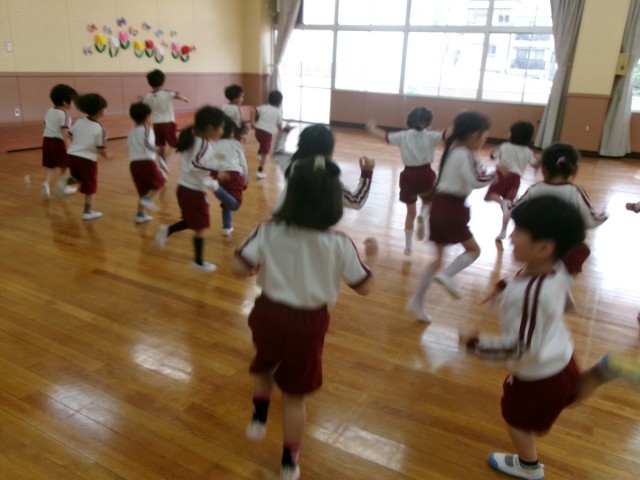 もも組さんもプレイルームに来てくれ、一緒にリズム遊びをしたり体操やかけっこをしたりしました。