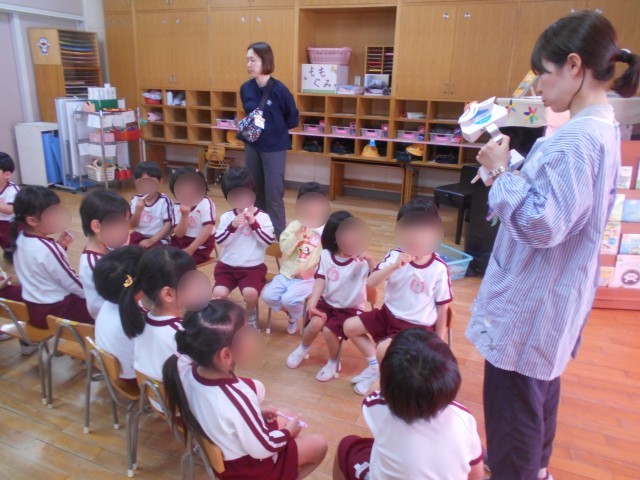 そして、食後の歯磨きも、歯磨き先生として、4歳児の前に座って、歯ブラシの持ち方や磨き方などをお手本を見せながら一緒にしていました。