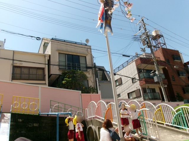 ももぐみ、きぐみ、みんなでわっせわっせとこいのぼりを運んで、「こいのぼり」の歌を歌いながら揚げました。