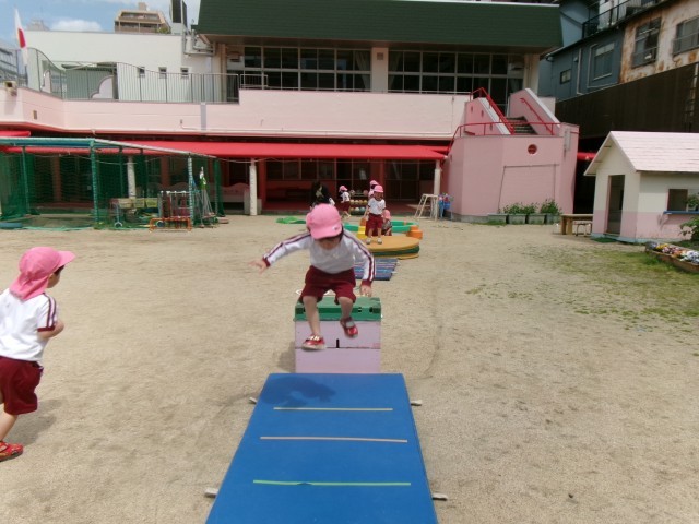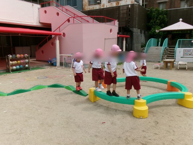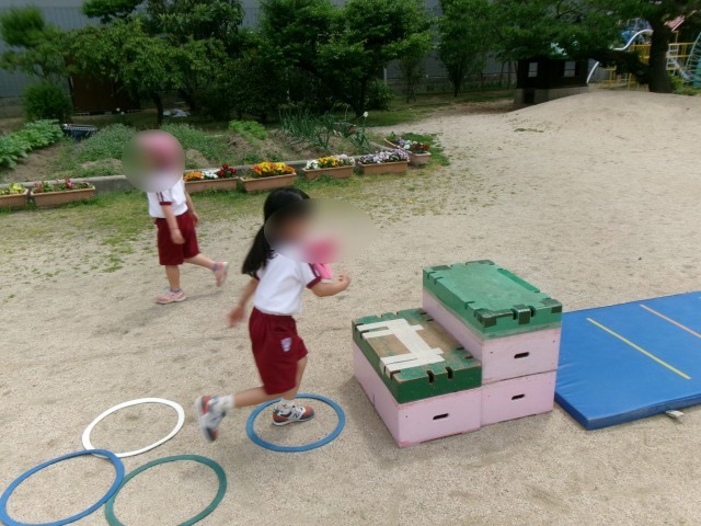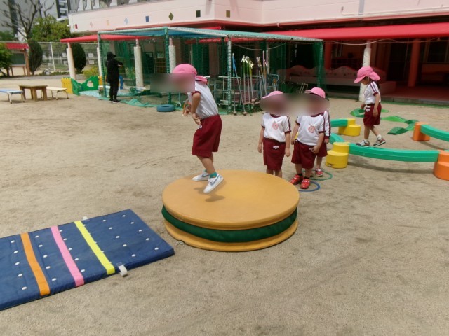 「先生、みてみて」とトランポリンをしたり、平均台に皆で挑戦したり、ケンケンパをしたりと、