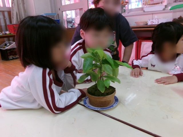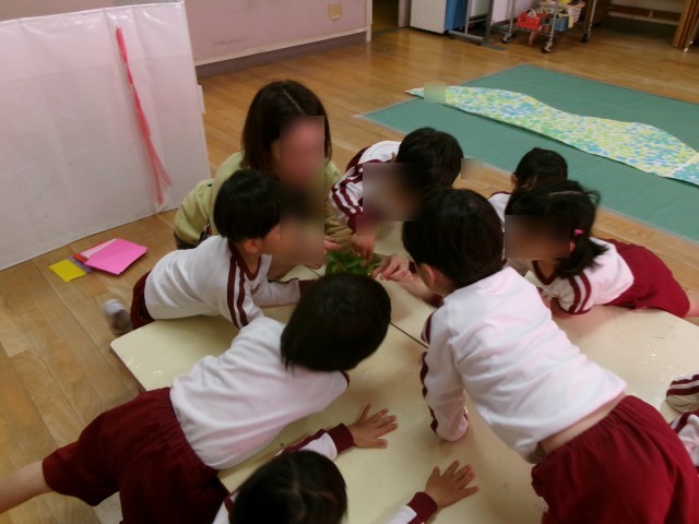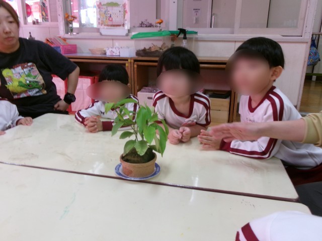 「チョウチョウの赤ちゃん?」「なんか、可愛い」「やっぱりちっさ(小さい)」と見たこと、感じたことを伝え合う子ども達。