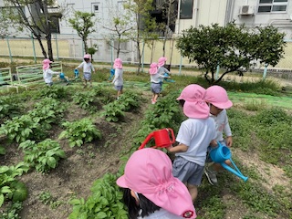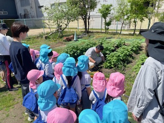 グラウンドに行くと、事業担当主事さんがジャガイモ畑の草抜きをしてくれていました。ジャガイモに栄養が行き届くようにしてくれていることを知った子どもたちは、遊びの中で一緒に草抜きをしていました♪