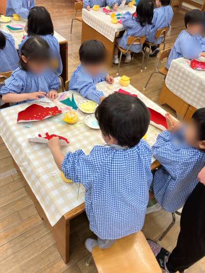 丸いシールをたくさん貼ったり、指でちぎった緑の折り紙をどこに貼ろうかな?と考えたり、つくることを楽しみました。