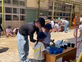 保護者の方と一緒に選んだ夏野菜(ミニトマト・オクラ・ナス・ピーマン)の苗を植えました。