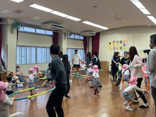 もも組(4歳児)は、フープを使って一緒に遊びました。保護者の方とフープでいろいろな動きを楽しみました。大きなフープなので、いろいろな遊びができて楽しかったですね!
